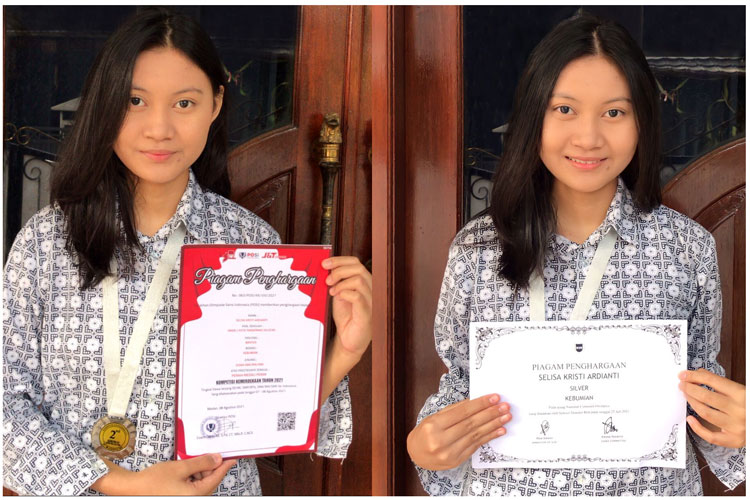 Selisa Kristi ARDIANTI, siswi kelas XI MIPA-1 ini berhasil meraih dua penghargaan berupa medali perak dalam ajang lomba bidang kebumian tingkat nasional. Satu medali perak diraih melalui kompetisi Kemerdekaan yang dilaksanakan oleh Pelatihan Olimpiade Sains Indonesia (POSI) dalam rangka memperingati HUT RI ke-76 pada tanggal 08 Agustus 2021. Satu medali lagi diperoleh dari ajang National Cynosure Olympics yang diadakan oleh School Thunder Bolt pada tanggal 25 Juli 2021.