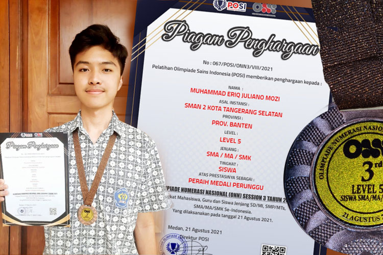 Muhammad Eriq Juliano Mozi, siswa kelas XI MIPA 9 berhasil meraih medali perunggu pada Olimpiade Numerasi Nasional (ONN) Session 3 tahun 2021. Ajang lomba ini diselenggarakan oleh Pelatihan Olimpiade Sains Indonesia (POSI) pada 21 Agustus 2021 secara daring.