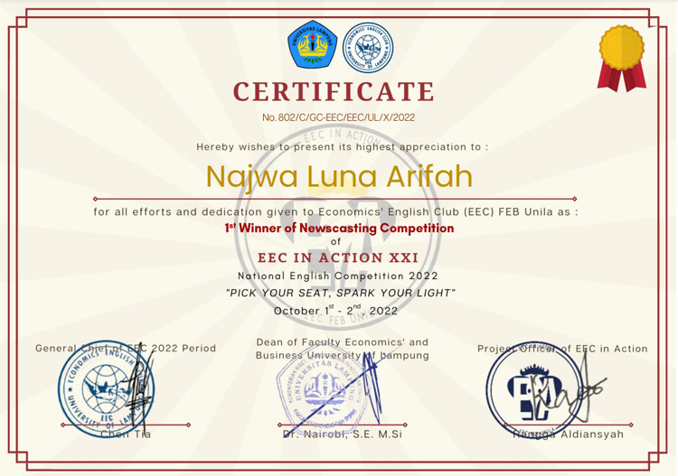 Najwa Luna Arifah Kelas (XII MIPA 4) kembali mempersembahkan prestasinya yang luar biasa. Prestasi kali ini dalam ajang EEC (Economics' English Club) in Action XXI, Luna berhasil keluar sebagai juara 1 "Newscasting Competition". Ajang lomba tingkat nasional ini mengambilĀ tema " MONKEYPOX WAS DECLARED AS A GLOBAL PUBLIC HEALTH EMERGENCY OF INTERNATIONAL CONCERNā€ di selenggarakan pada 1-2 Oktober 2022 oleh Fakultas Ekbis Universitas Lampung.
